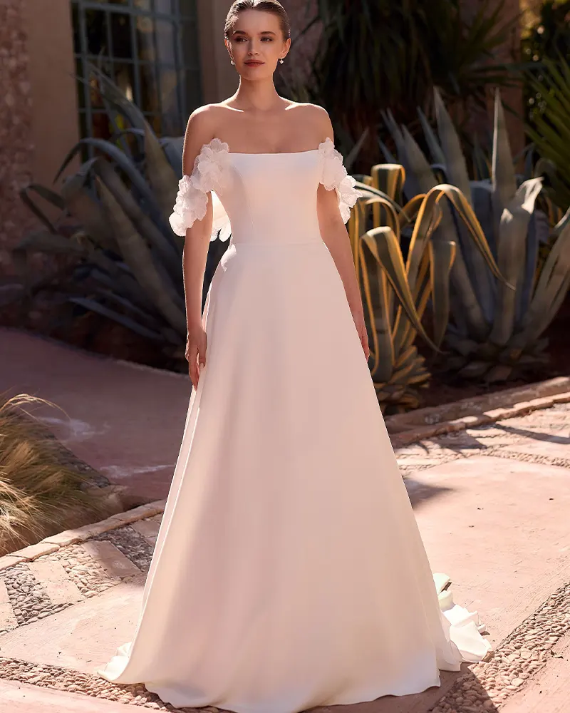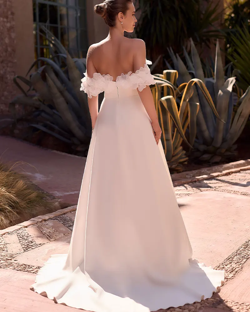 Το νυφικό BETSI κατασκευασμένο από μαλακό ύφασμα,είναι πριγκιπικό και πολύ ανάλαφρο, με εντυπωσιακά χειροποίητα λουλούδια που στολίζουν πανέμορφα το πλαινό μέρος του χεριού.