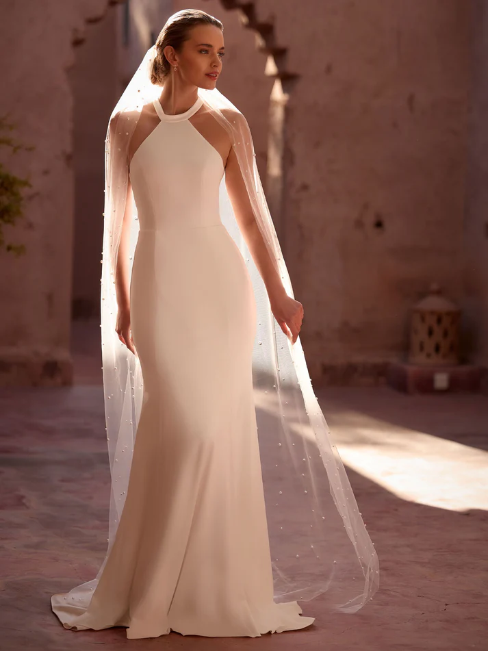 Το Νυφικό KATRIS είναι ένα elegant column-cut νυφικό ραμμένο από υψηλής ποιότητας stretch κρεπ, που αγκαλιάζει τη σιλουέτα με άψογη εφαρμογή.