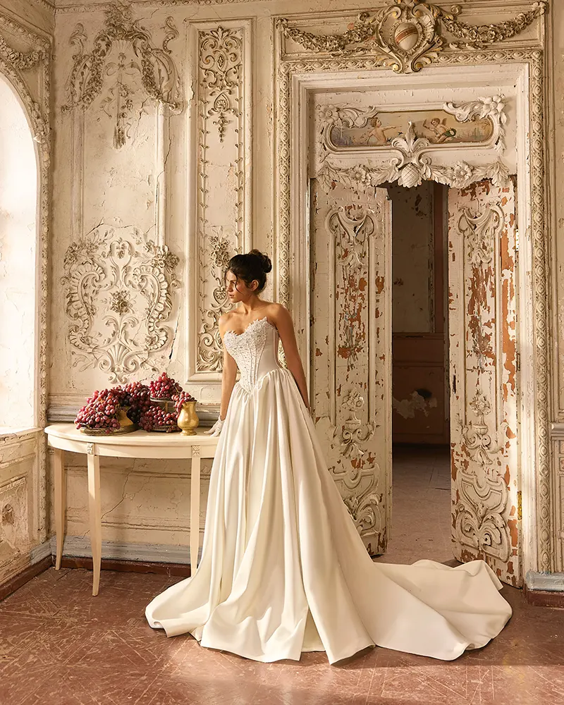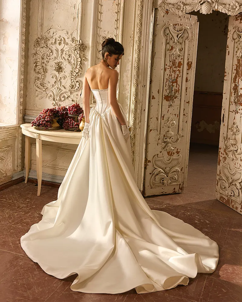Το εντυπωσιακό strapless μπούστο με διακριτική καρδιά αγκαλιάζει το σώμα, προσφέροντας σταθερότητα και άψογη εφαρμογή. Οι λεπτομέρειες δαντέλας και η ιδιαίτερη κατασκευή του κορσέ τονίζουν τη μέση και χαρίζουν μία φίνα, θηλυκή γραμμή. Η φούστα ανοίγει σε εντυπωσιακή Α γραμμή, με πλούσια ροή και αέρινη κίνηση που καταλήγει σε κομψή ουρά, δημιουργώντας μία πραγματικά παραμυθένια εικόνα.