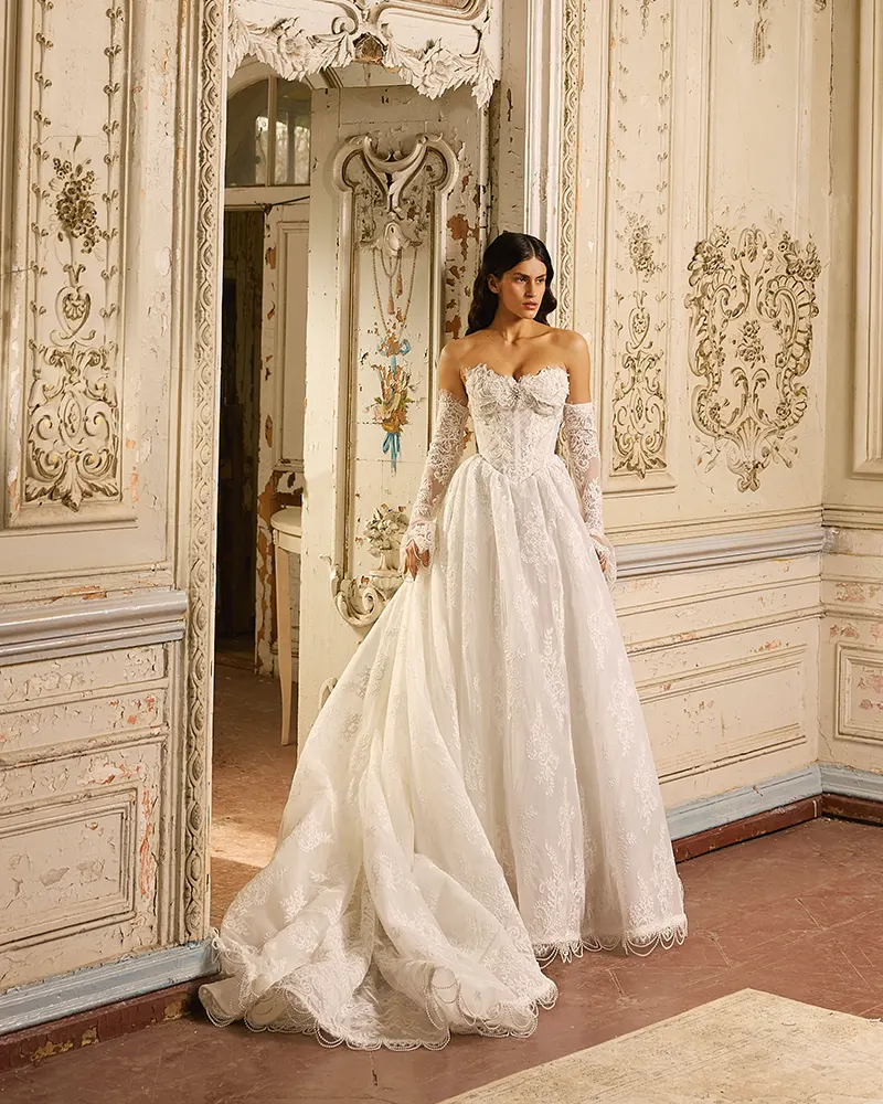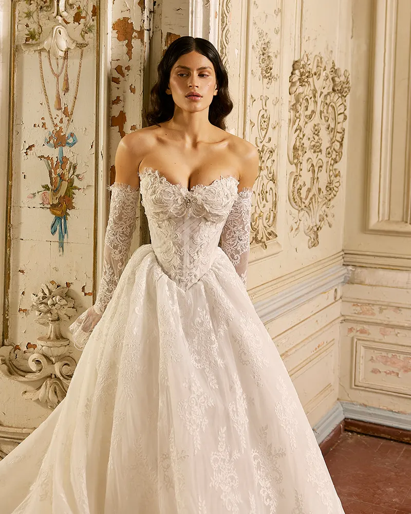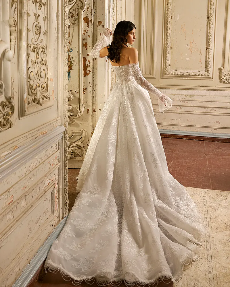 Αυτό το εντυπωσιακό νυφικό πριγκίπισσας από δαντέλα είναι η ιδανική επιλογή για τη νύφη που ονειρεύεται ρομαντισμό, κομψότητα και διαχρονική φινέτσα.