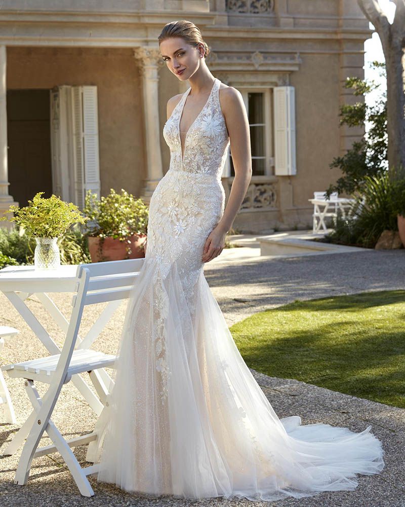 Το μπούστο του NYLAH δένει στο λαιμό, προσθέτοντας μοναδικό στυλ και διακριτικό sexy touch, ιδανικό για νύφες που θέλουν ένα fashion-forward αλλά elegant look.